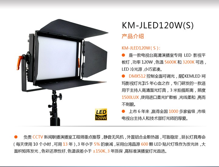KEMLED 珂瑪影視燈光LED影視平板燈KM-JLED120W是一款電視臺專業(yè)的影視平板燈,大功率電視平板專用燈,采用國際知名品牌小功率LED燈珠作為發(fā)光體。光效率高:光譜集中于可見頻率,效率可以達(dá)到80%-90%,形成大面積矩陣發(fā)光,顯色性好,眩光值低,無陰影重影;采用金屬外殼外置散熱器,外形精致,結(jié)構(gòu)輕巧,結(jié)構(gòu)結(jié)實(shí),具有良好的散熱性。光通量衰減到70%的標(biāo)準(zhǔn)壽命是5萬小時,一個燈正常情況下可以使用10年以上,LED作為發(fā)光體,120W相當(dāng)于600W白熾燈的照度,在同樣亮度下耗電量僅為普通白熾燈的1/5。