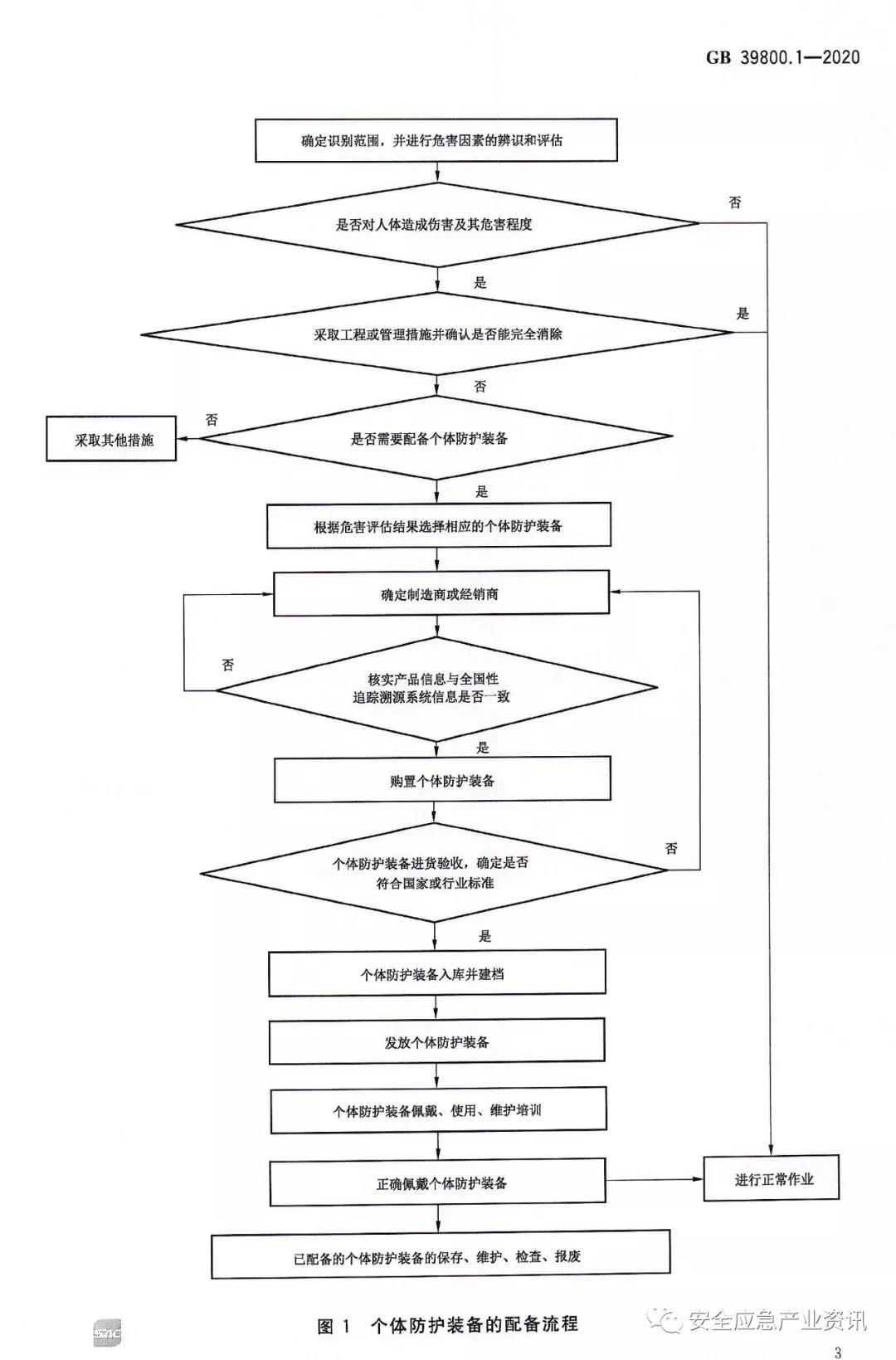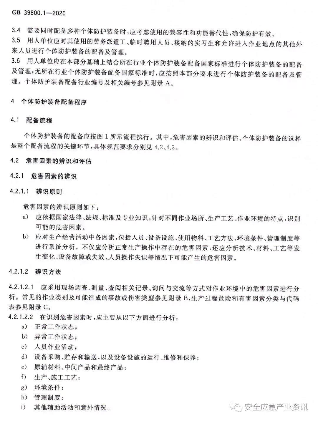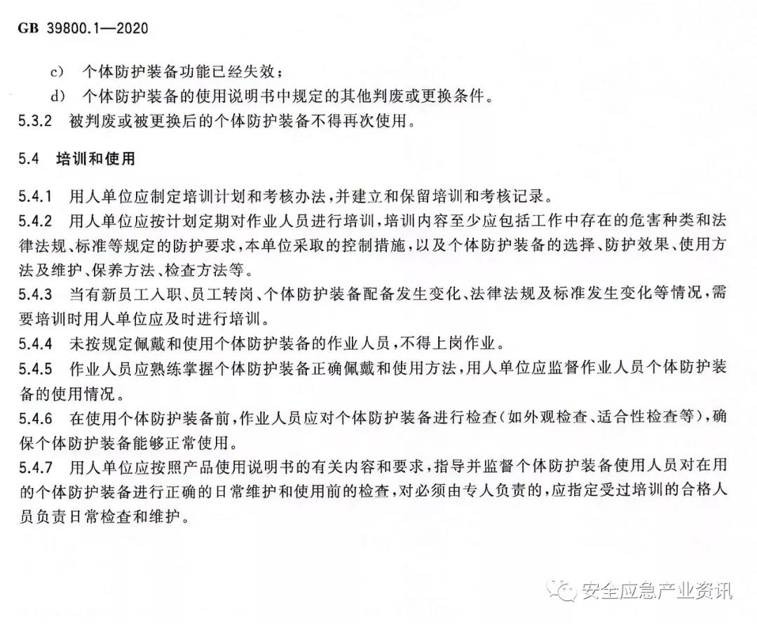 GB39800.1-2020《個(gè)體防護(hù)裝備配備規(guī)范第1部分:總則》規(guī)定了個(gè)體防護(hù)裝備(即勞動(dòng)防護(hù)用品)配備的總體要求,包括配備原則、配備流程、作業(yè)場(chǎng)所危害因素的辨識(shí)和評(píng)估、個(gè)體防護(hù)裝備的選擇、追蹤溯源、判廢和更換、培訓(xùn)和使用等。
