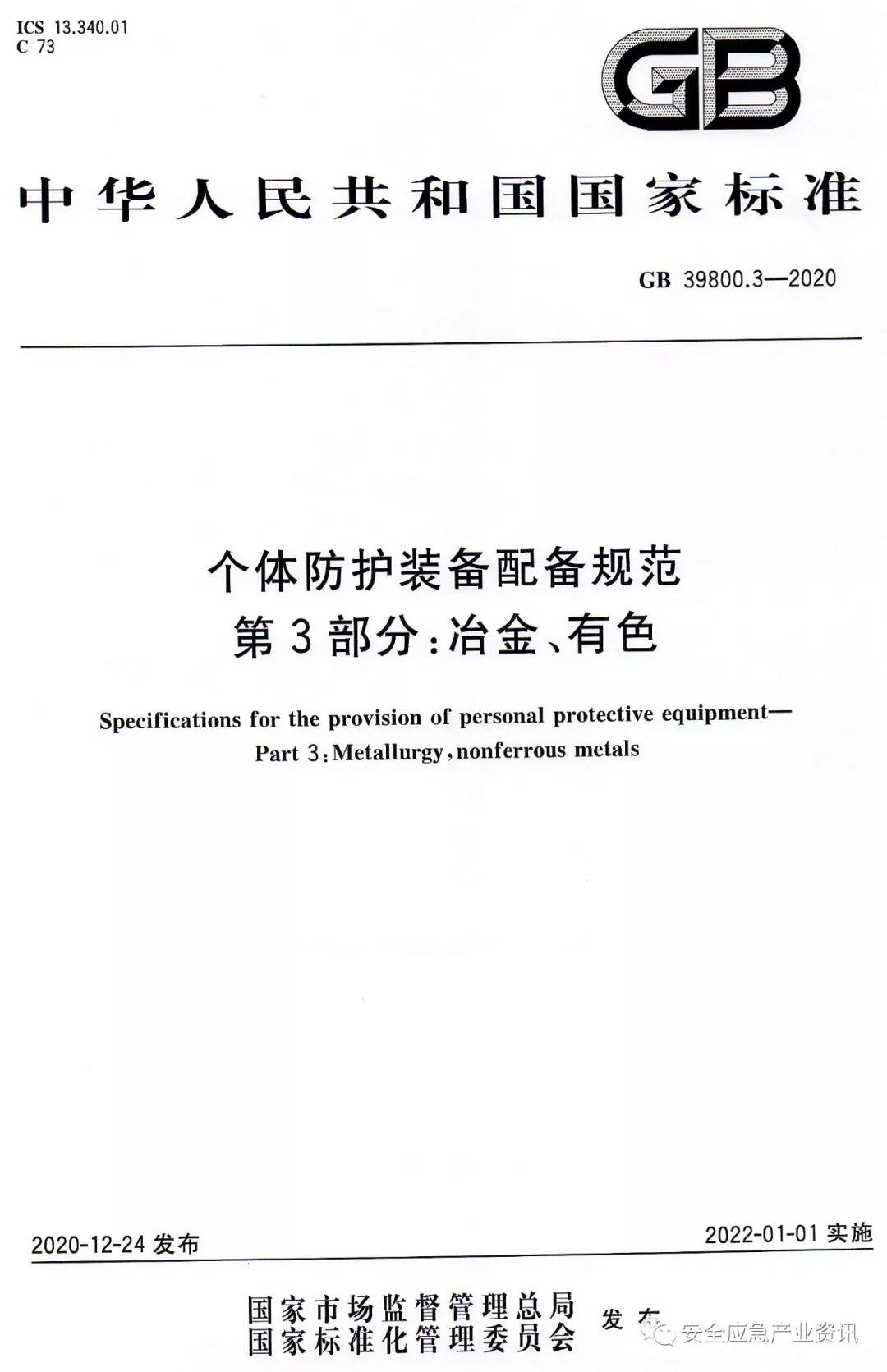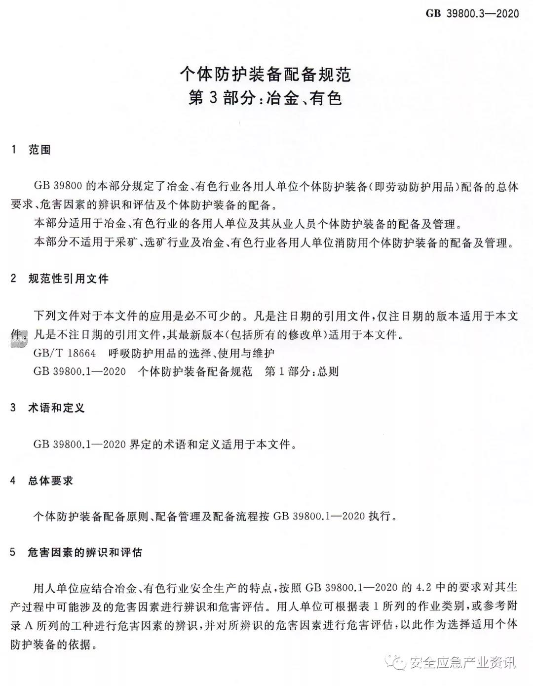 GB39800.3-2020《個(gè)體防護(hù)裝備配備規(guī)范第3部分:冶金、有色》規(guī)定了冶金、有色行業(yè)各用人單位個(gè)體防護(hù)裝備(即勞動(dòng)防護(hù)用品)配備的總體要求、危害因素的辨識(shí)和評(píng)估及個(gè)體防護(hù)裝備的配備。