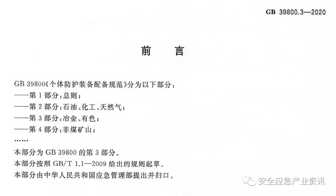 GB39800.3-2020《個(gè)體防護(hù)裝備配備規(guī)范第3部分:冶金、有色》適用于冶金、有色行業(yè)的各用人單位及其從業(yè)人員個(gè)體防護(hù)裝備的配備及管理,不適用于采礦、選礦行業(yè)及冶金、有色行業(yè)各用人單位消防用個(gè)體防護(hù)裝備的配備及管理。