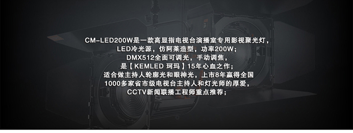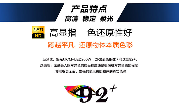 珂瑪LED數(shù)字聚光燈CM-LED200W采用高顯色指數(shù)大功率LED模組作為發(fā)光元件,采用非球面光學聚光系統(tǒng),配以高質(zhì)量菲涅耳透鏡,具有光效高、顯色性好、眩光值低和壽命長等諸多優(yōu)點。